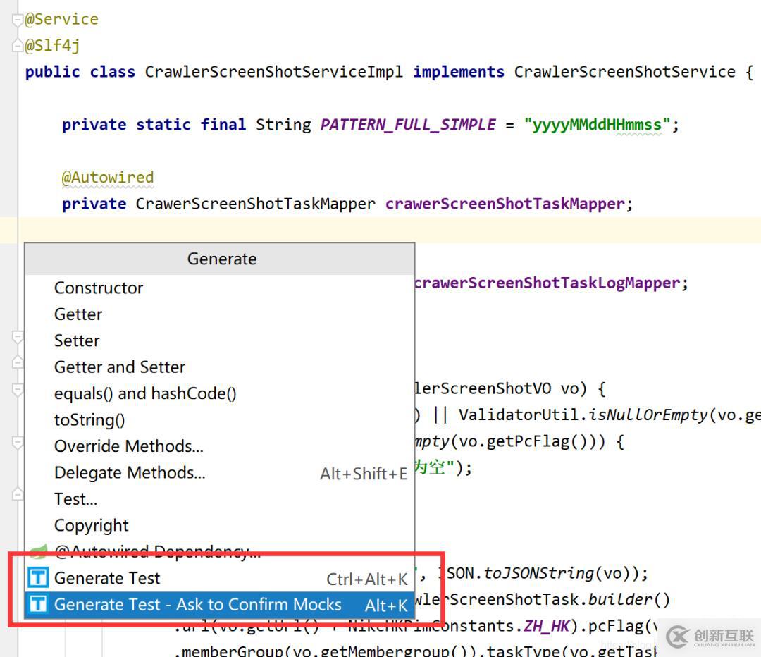 如果我們要手工編寫這個類的單元測試,那么需要一段時間來研究它?,F在讓我們來看看我的操作。打開類,將光標放在代碼中,然后右鍵單擊鼠標以選擇Generate…