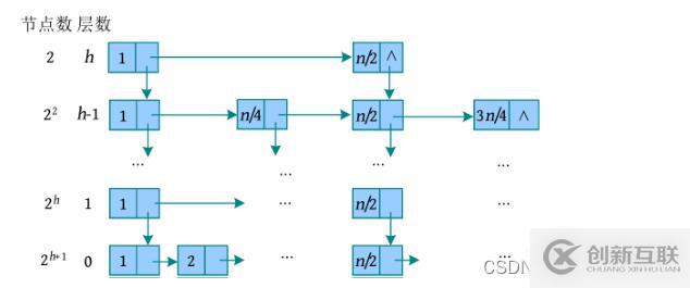 二?算法分析若有 n 個元素,則增加 h 級索引后的數據結構如下圖所示。