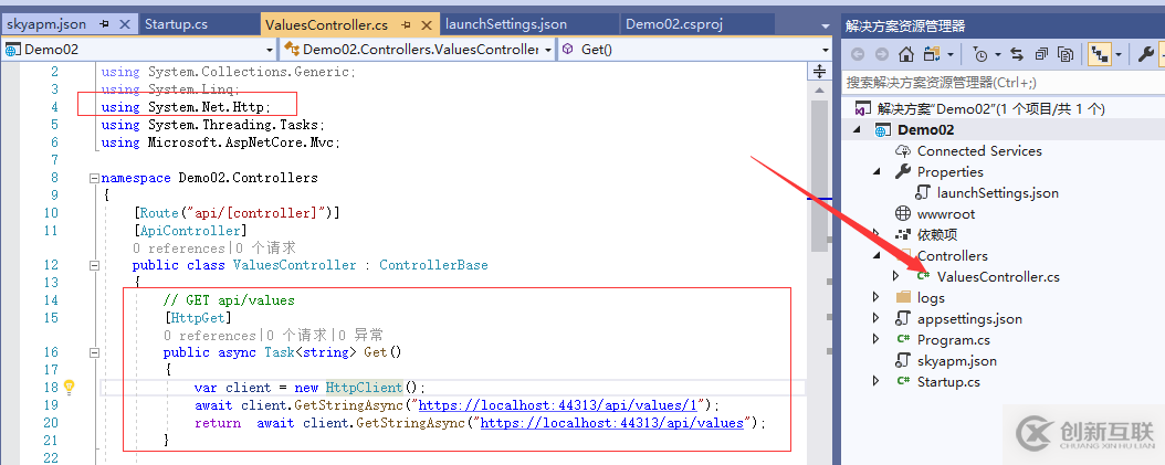 3.5:在ValuesController.cs中添加引用: System.Net.Http ,通過HttpClient依次調(diào)用Demo01的兩個方法,里面的https://localhost:44313對應(yīng)為我們的Demo01項目。具體Get方法代碼如下: