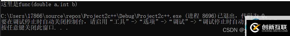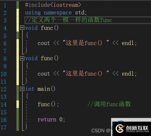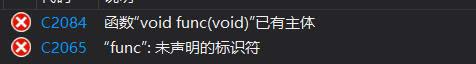 編譯器顯示void?func函數已有主體,這就是我們定義兩個一模一樣的函數導致的,由于在同一個源文件中,函數的作用域相等,故我們只修改第三個條件,下面我們來修改其中一個函數的參數