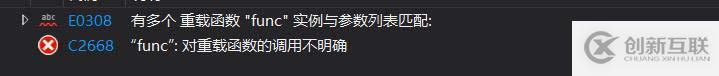 當我們定義兩個一模一樣的函數,在主函數調用時,編譯器傻了,因為調用func()時上面兩個函數都符合,編譯器不知道該調用哪個,我們來看編譯器報錯信息
