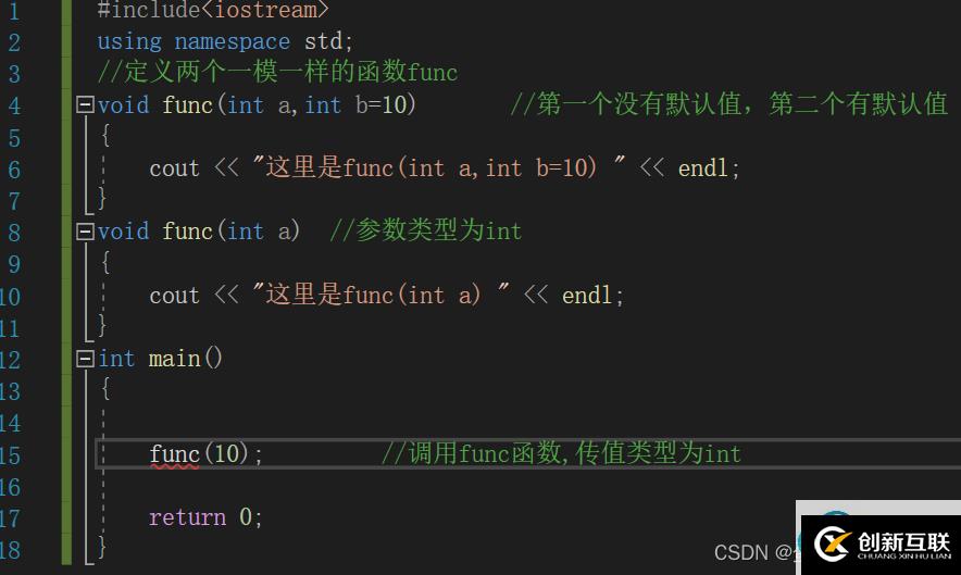 當我們在主函數調用func(10)的時候,由上面默認參數的性質可以知道,兩個函數都滿足調用條件,故編譯器因為二義性報錯