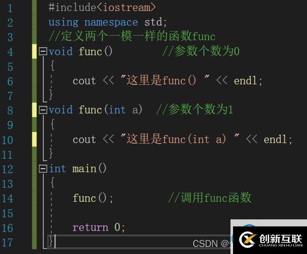 第一個函數參數個數為0,第二個函數個數為1,當我們在主函數調用func()時,大家可以猜下會調用哪個函數呢,結果肯定是第一個沒有參數的函數,因為調用時沒有傳參