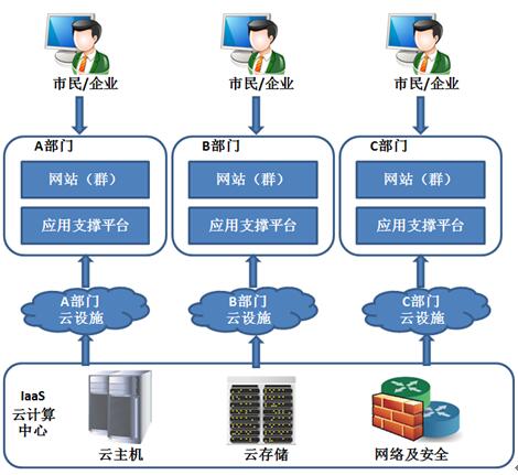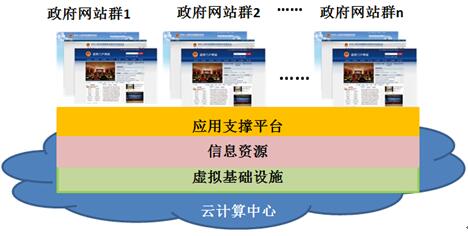 基礎設施集約化是最基礎的集約化方式,解決機房和設備上的重復投資、重復建設、資源不能充分利用而造成浪費的問題。基礎設施集約化若用云計算中心方式進行建設,建議一級政府(如:省部級、地市級)建設一個云計算中心,以云服務方式向各網站主辦單位提供虛擬設施資源,達到節省資金、提高設備利用率、節能減排的效果。目前,此類集約化所使用的云計算技術和管理模式已成熟,并已有成功經驗,但安全風險也會集中。