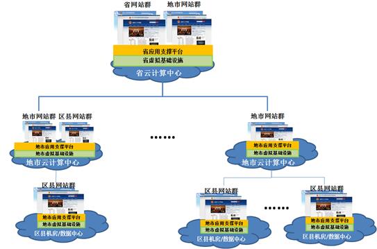 地方政府的應用支撐平臺集約化可分為省級、地市級和區縣級三級集約方式。省級政府網站應用支撐平臺集約化可基于省云計算中心進行建設,省級政府網站群、地市級政府網站群均在此平臺上進行建設、維護和運營。地市級平臺和縣級平臺以此類推。在做地方集約化平臺時,應滿足上級對下級平臺的日常監管需要。