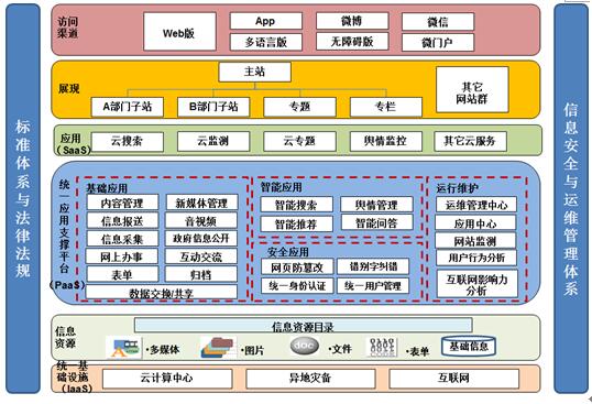 應用支撐平臺在整個網站體系架構中,起著承上啟下的作用,為政府網站的建設、管理、維護及網站上各類應用和服務提供技術支撐,為網站運行提供了軟件環境。應用支撐平臺優先選用PaaS+SaaS私有云云服務方式,平臺必須穩定、安全,平臺開放性和可擴展性是滿足個性化需求的關鍵。若一級政府建設一個集約平臺,建議標準先行、分步遷移。此類集約方式技術難度小、見效快、安全風險集中,容易被少數廠家壟斷。