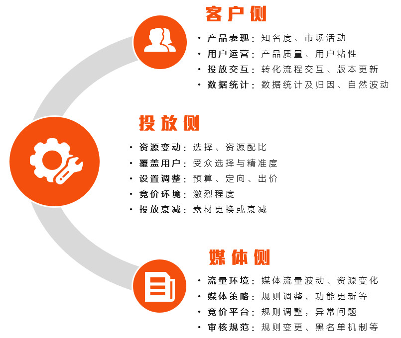 作為一名優秀的優化師,你應該具備通過數據分析快速定位投放問題的能力,而以下三方任意一方的變動,都可能會導致廣告數據出現波動。