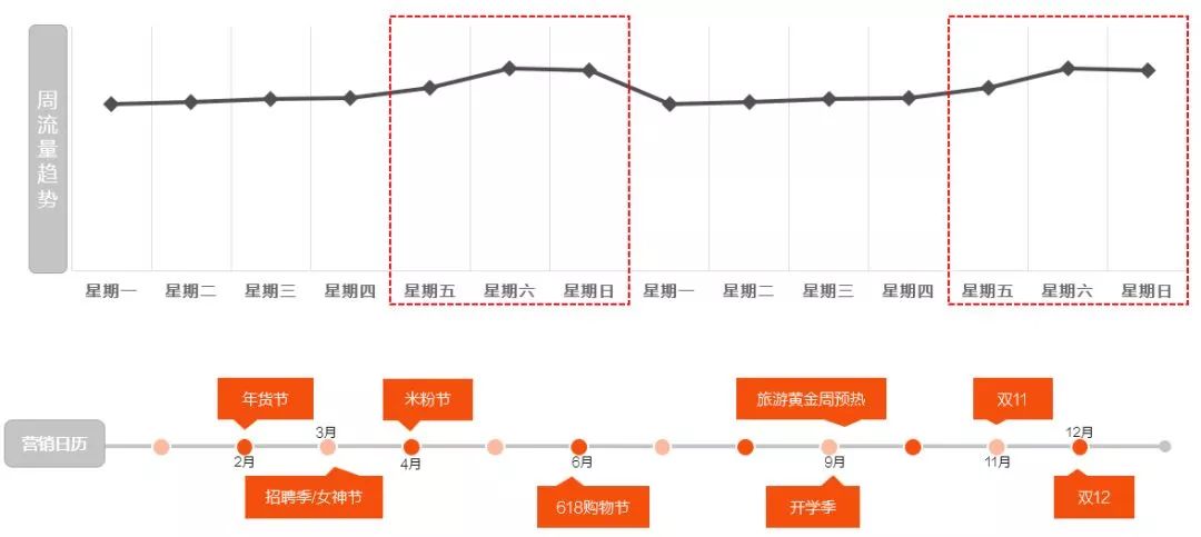 媒體流量高峰出現在每周的周五至周日、各節假日假期期間;每個流量高峰過后,客戶拿量量級會有一定降幅。另外,品牌占量比例增大、特定行業放量節點等都會引起效果廣告大盤流量吃緊。