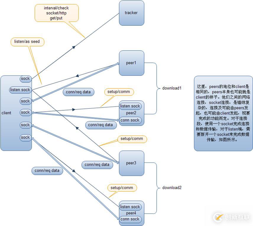 關于套接字編程,這里最后再補充一點。我們用的手機、電腦等產品,其上跑的網絡應用豐富多彩,而且很多是同時在用的,所以,通過套接字接口構建的虛擬通道,在一臺設備上,可以存在多個,且每個彼此是獨立的,可以認為相互不影響(排除對內存、帶寬等資源的占用影響)。不僅僅是設備級別,即使在一個應用中,這種虛擬通道也可能存在很多個。虛擬通道的關鍵構建元素是網絡五元組,即{源地址、源端口、協議、目的地址、目的端口},所以,設備節點間的虛擬通道是N:N的映射關系。早年筆者接觸過BT協議下載軟件,對此還是深有感觸的。下面這幅圖,是當時理解多個下載上傳通道時畫的。