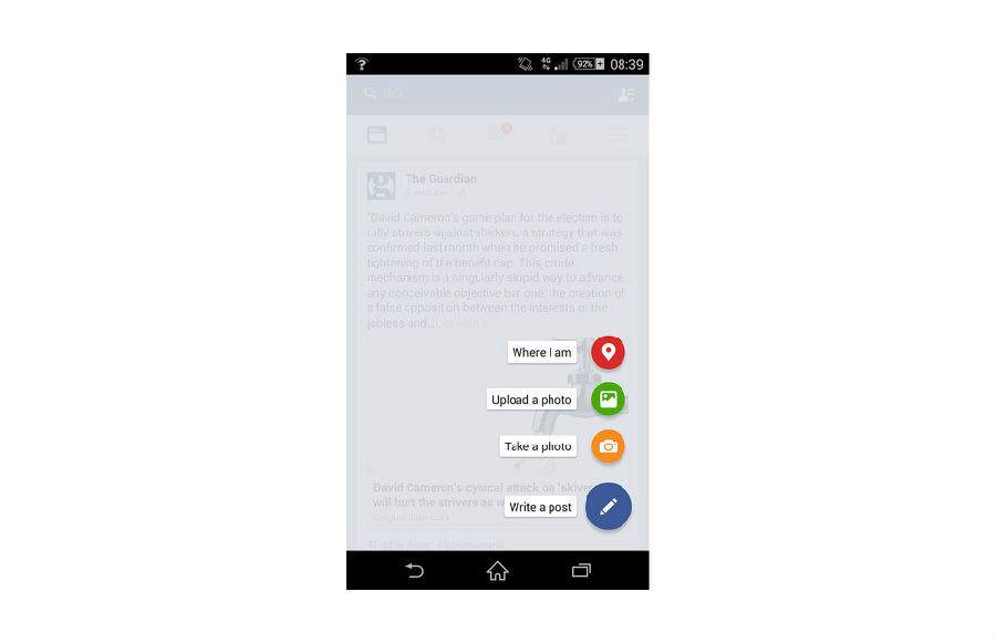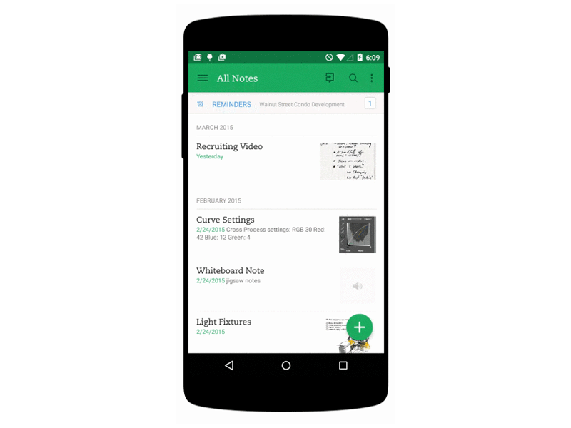 3、提供一組動作(多個)在某些情況下,它是適當的按鈕旋轉,讓其他幾個選項,可以在下面看到Evernote。Fab可替換自身一系列更具體的行動,你可以設計你的用戶是語境。作為一個經驗法則,提供至少三個選項后,按不超過六(含原浮動作按鈕的目標)。