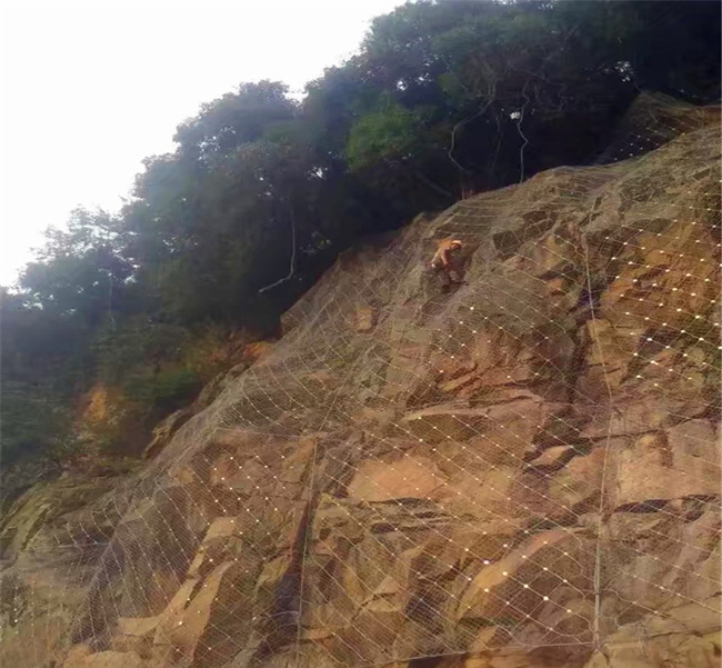 主動邊坡防護(hù)網(wǎng)是以鋼絲繩網(wǎng)為主的各類柔性網(wǎng)覆蓋包裹在所需防護(hù)斜坡或巖石上,主要是起兩個(gè)作用加固作用和圍護(hù)作用,其中加固作用是以限制坡面巖石土體的風(fēng)化剝落或破壞以及為巖崩塌;圍護(hù)作用是將落石控制于一定范圍內(nèi)運(yùn)動。