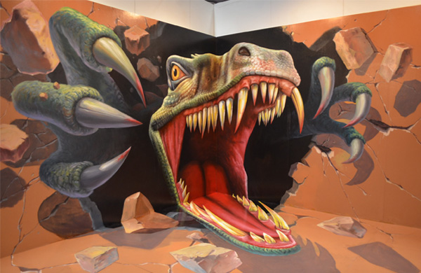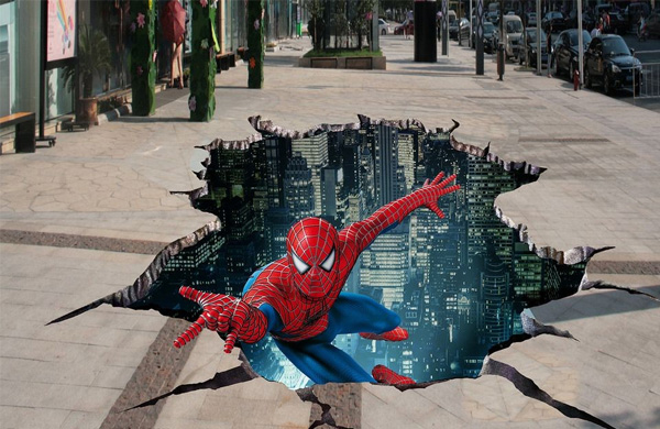 3D街頭涂鴉,則將"藝術(shù)效果特殊化"的理念進一步發(fā)揚光大,它以室外地面為媒介,利用平面透視的原理,制造出視覺上的虛擬立體效果,令參觀者有一種身臨其境的感覺。3D街頭地畫中的景物立體、細(xì)膩、逼真,往往能達(dá)到以假亂真的藝術(shù)效果。