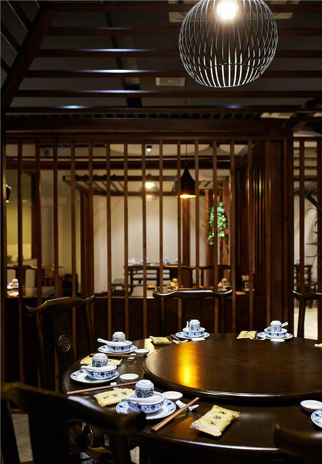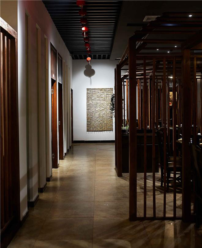 2、空間以“屋中屋”、“廊架”的構(gòu)架形式,運(yùn)用木格柵將整個餐廳的區(qū)域有層次的分開,所有空間通而不透,隔而不絕。用最簡單、最純粹的設(shè)計,打造最具強(qiáng)烈的視覺體驗,使得觀者在每一塊欄柵的縫隙間移步換景、光影隨形。這種質(zhì)樸的優(yōu)雅氣質(zhì),彌漫整個餐廳,給人一種簡約而不簡單的空間氣蘊(yùn)。