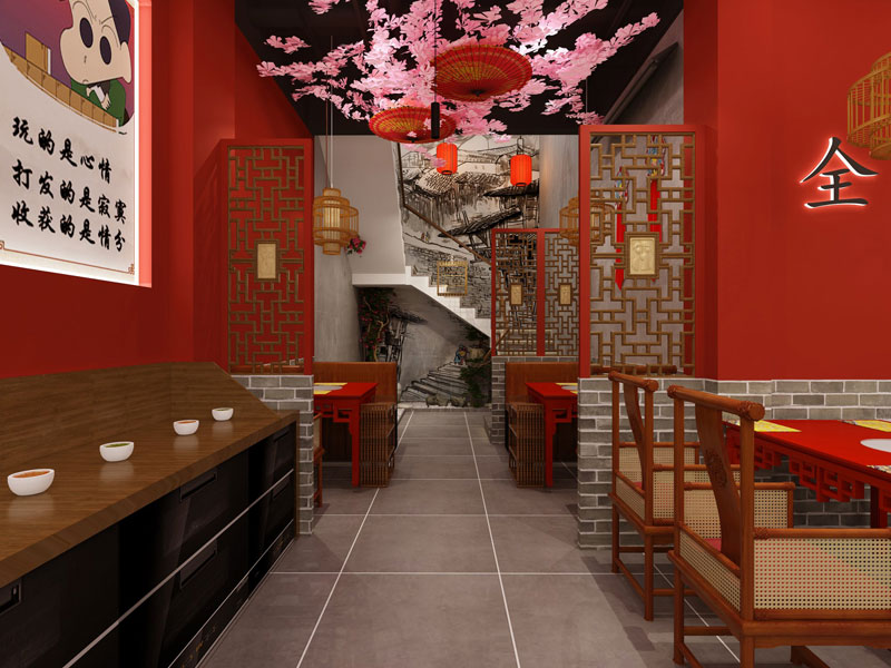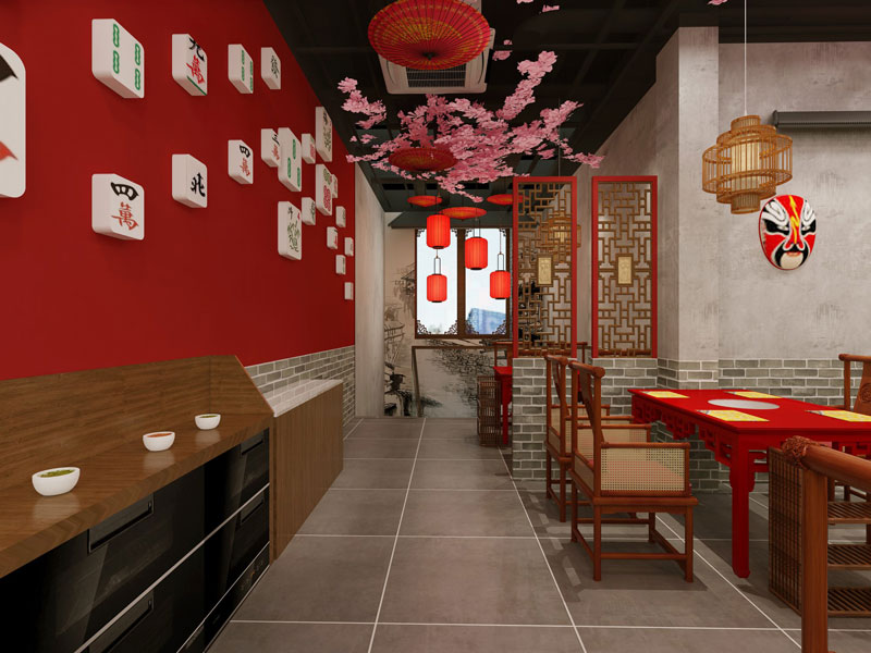 中國風火鍋店設計以中國紅作為主色調,仿古地磚作做為地面主要裝修材料,油紙傘與竹制品作為裝飾,打造復古中國風。