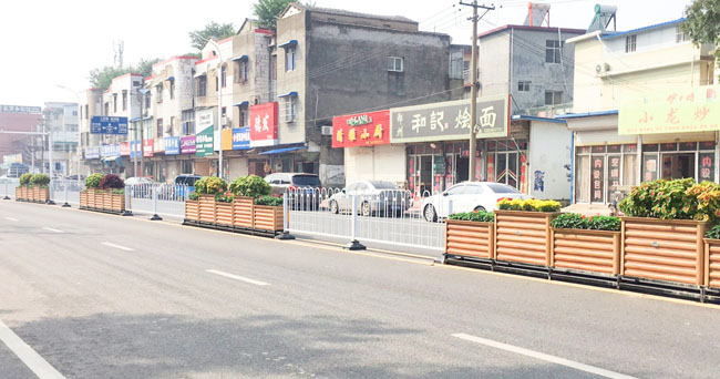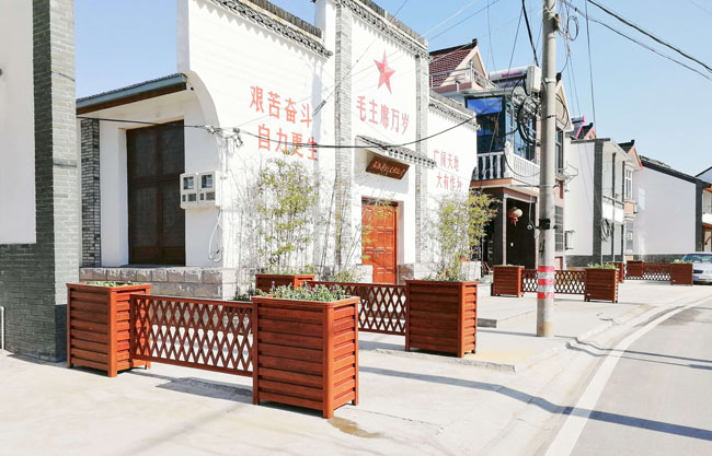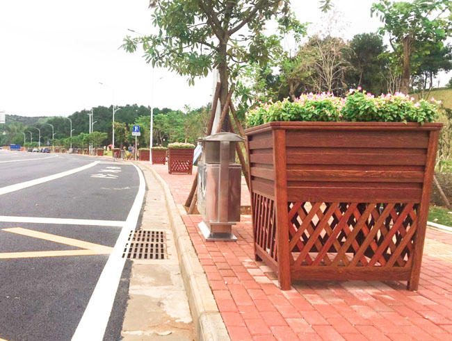 中國的許多鄉村都擁有悠久歷史。紅木色外觀能夠體現出鄉村的文化底蘊。紅木色花箱與道路兩側綠色喬木顏色也相配,兩者也能高低呼應。對于人、車流量大的鄉村,中央道路隔離花箱是必要的。長城花箱結合網格護欄,既不會阻擋行車視線,又給鄉村增添了獨特的魅力。網格造型讓花箱隔離帶疏密有致、充滿了鄉村的田園氣息,讓人感受到鄉村的閑適、放松。