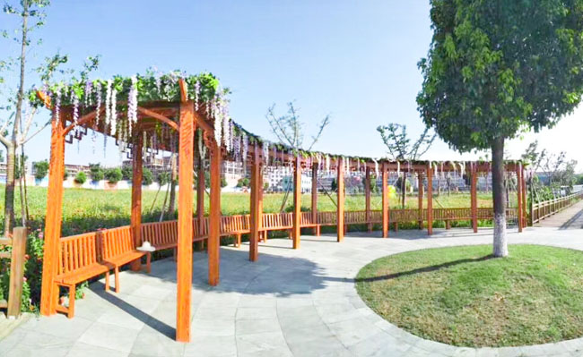 看慣了方方正正的葡萄架,有弧度的葡萄架就很有新意。葡萄架下方圍繞長椅,可以休息。雖然造型簡單,但是簡潔之美也令人賞心悅目。葡萄架上面用紫藤蘿覆蓋,既可以遮陽,又能用垂墜感裝飾葡萄架的頂部。葡萄架營造出的休閑長廊,能夠滿足村民的休閑娛樂。四面開闊、空氣清新,藍天白云、芳草如茵,新時代的農村面貌就在眼前。