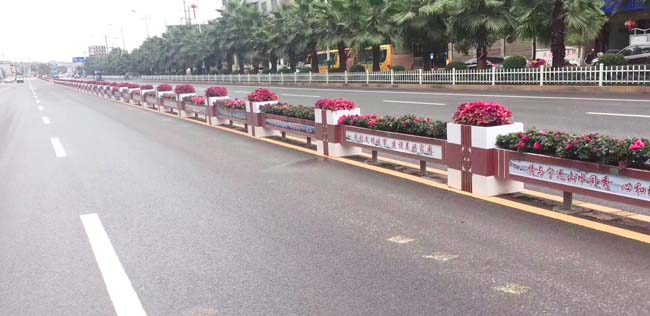 看似簡單的花箱外觀,實則添加了蝶紋設計。花箱表面增加地方文化標語也是道路中央隔離花箱的不錯選擇。高大棕櫚與低處的花箱遙相呼應,色彩和諧。近看花箱上古典紅與白色結合,美觀大氣。遠看紅色花卉與綠植相映襯,帶來宜人風景。