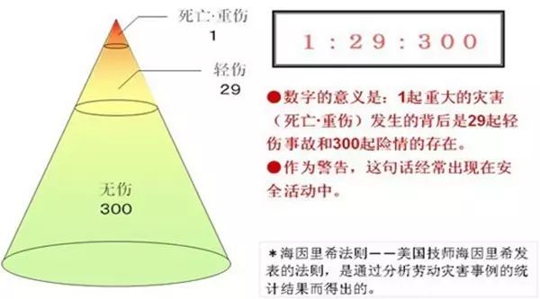 “海因里希法則”是美國著名安全工程師海因里希提出的300∶29∶1法則。通過分析工傷事故的發生概率,為保險公司的經營提出的法則。