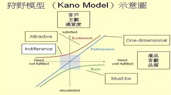 KANO 模型是東京理工大學教授狩野紀昭(Noriaki Kano)發明的對用戶需求分類和優先排序的有用工具,以分析用戶需求對用戶滿意的影響為基礎,體現了產品性能和用戶滿意之間的非線性關系。