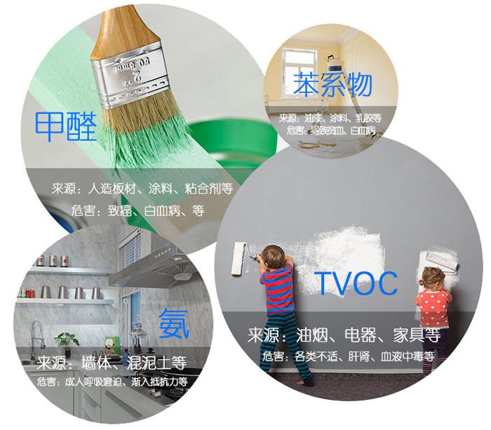 美國專家檢測發現,在室內空氣中存在500多種揮發性有機 物,其中致癌物就有20多種,危害較大的有:甲醛、苯、氨、 酯、三氯乙烯等。室內空氣的污染程度要比室外嚴重2-5倍,有時 可達到100倍。美國等發達國家已將室內空氣污染歸入危害人類健 康的5大環境因素。