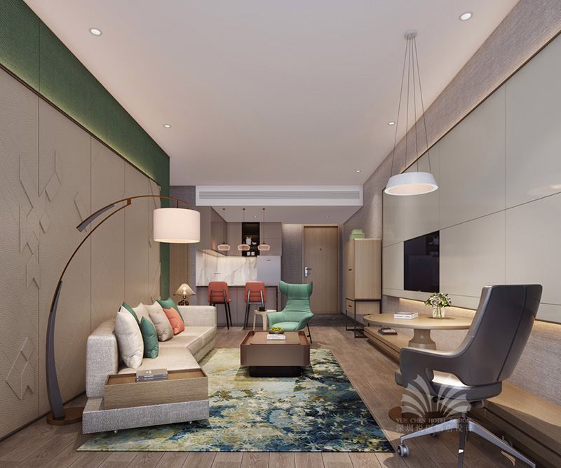 客廳以大白墻為背景、時(shí)尚的掛畫給客廳增添了一股現(xiàn)代感的氣息,木條拼接為主基調(diào)的設(shè)計(jì),通透的落地窗使得室內(nèi)光線十分充足。酒店設(shè)計(jì)中皮質(zhì)的沙發(fā)質(zhì)感細(xì)膩、室外的景觀跟室內(nèi)的軟包恰到好處的融合到了一起,使得整個(gè)空間氛圍溫馨靜謐,舒適自然。廚房的設(shè)計(jì)選用一些比較老舊的材料設(shè)計(jì),使得酒店設(shè)計(jì)整個(gè)空間具有一種獨(dú)特的工業(yè)美感,把廚房很好地從整體空間區(qū)分出來,分區(qū)明確。