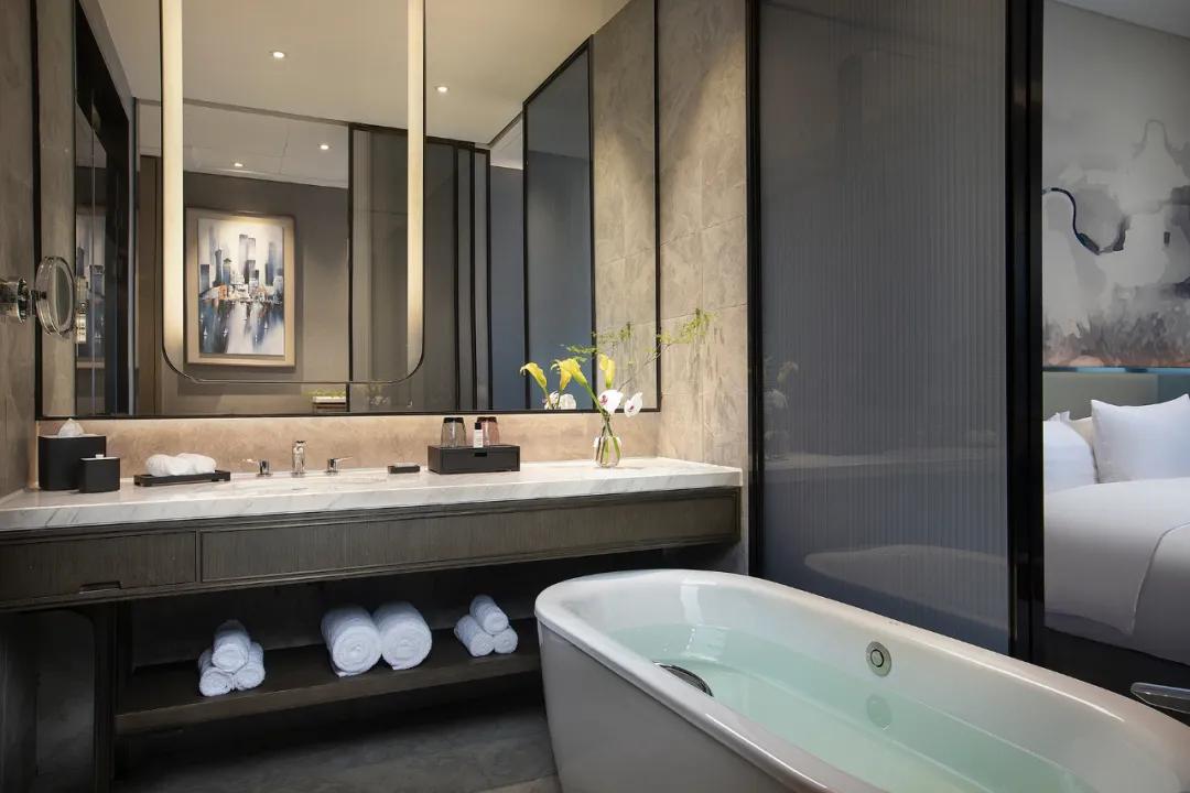 廁所已經發展成為人們享受完美生活的空間,其功能也從廁所和馬桶發展到按摩浴、美容和休息,幫助人們消除疲勞,身心放松。他們安靜或奢華或有趣。與五星級酒店的其他區域相比,客房中的洗手間似乎不那么重要,但它可以極大地影響對客房的評價。客人往往對五星級酒店的衛生間有更高的期望,希望其設計獨特、舒適、美觀,給人一種全新的生活體驗。高端酒店衛生間的設計材料大部分是大理石的,會給人更高端的感覺。
