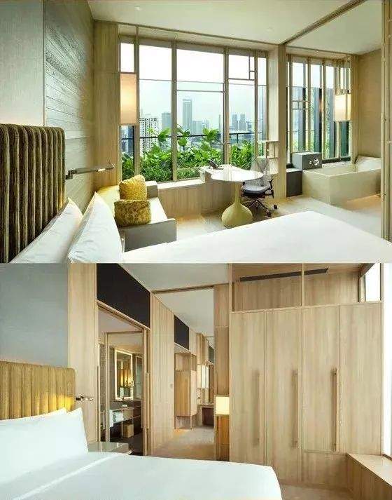從挑高而通透的一樓大廳開(kāi)始,酒店里隨處可見(jiàn)水池、瀑布、熱帶植物及植生墻,加上大量的木頭、石材、竹子等天然建材,以及梯田般層層堆棧的流線型天花板,猶如奢華版的熱帶庭園,將繁忙的商業(yè)區(qū)大街隔絕在外。