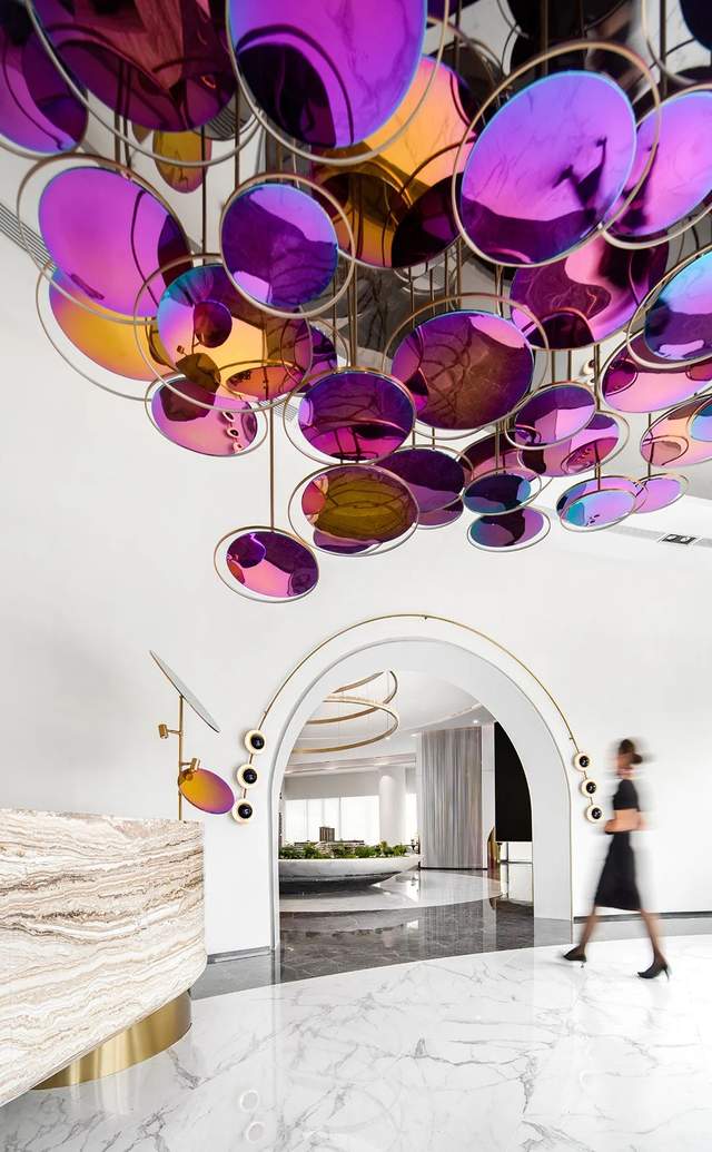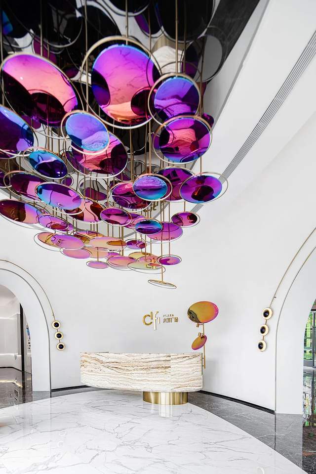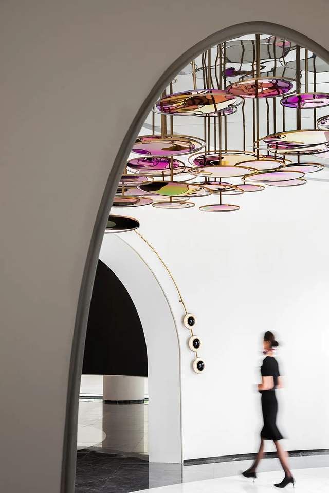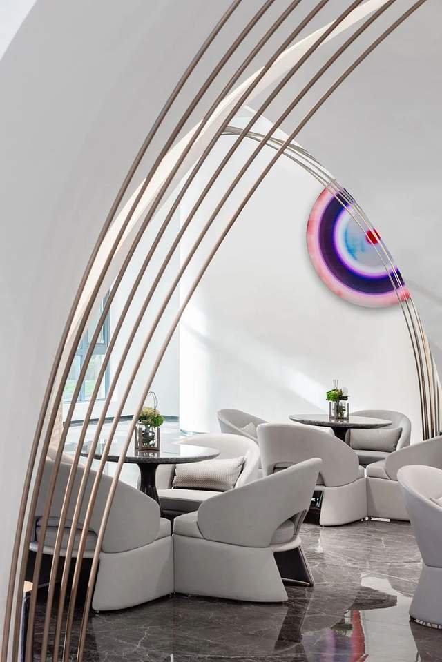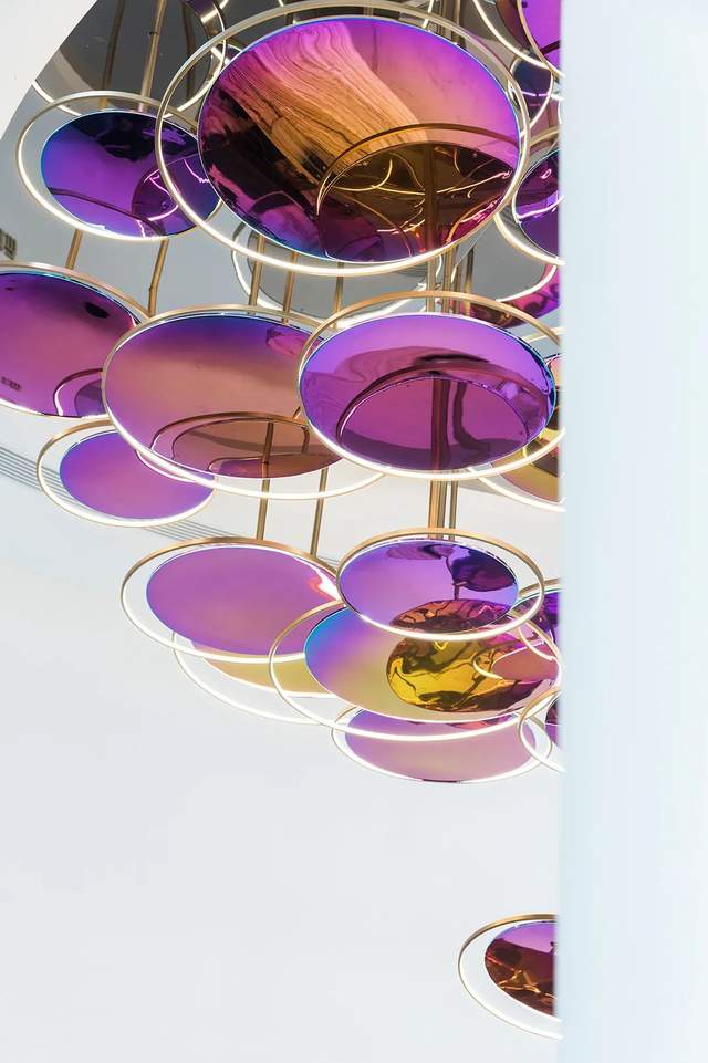 隨處可見的圓環(huán)與弧線,為凝固的空間注入了流動(dòng)與韻律。像是從屋頂葳蕤生長(zhǎng)出來的彩色荷葉,金屬鏡面互相倒影,影影綽綽。絢麗的藍(lán)紫色,稀釋了以白色為主調(diào)的前場(chǎng)區(qū)室內(nèi)環(huán)境所帶來的冷清感,而著上了些許夢(mèng)幻情調(diào)。