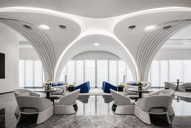 白色主調(diào)蘊(yùn)含靜謐,亮麗藍(lán)色潛藏活力。洽談區(qū)落地窗前擺放著多組圓桌沙發(fā),窗明幾凈,圓弧形屋頂下,既希冀著人們良好和諧的交流合作,也包容著愜意舒適的休閑氛圍。娓娓道來的需求和想法,循序漸進(jìn)的深淺洽談,在此徐徐展開。有緣而聚,和而不同。