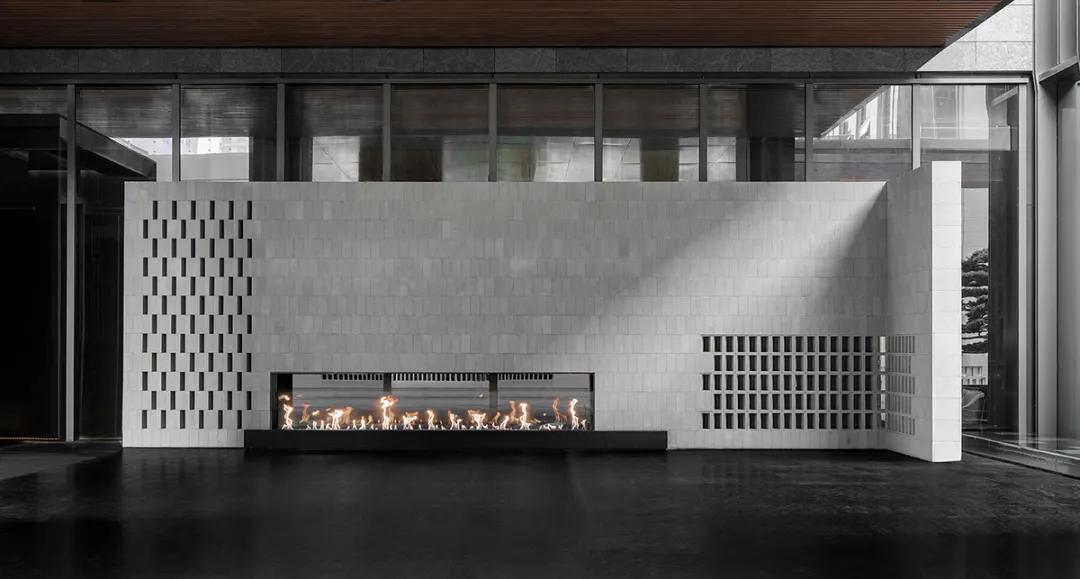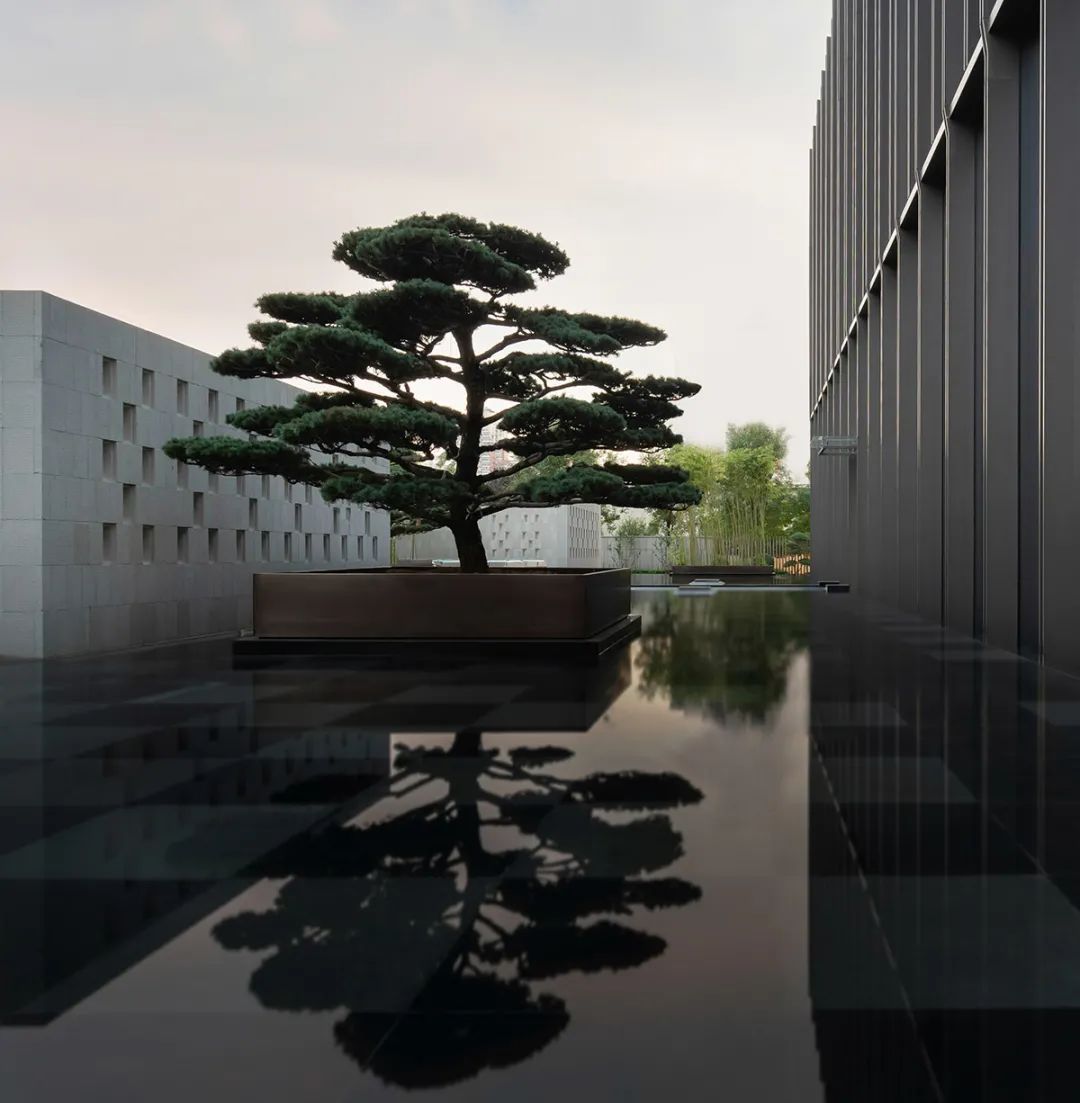 低調(diào)的酒店入口隱而不露,僅一棵蒼勁的黑松樹如使者般迎候著,引人循著幽幽燈光,沿著錯落的青灰色鏤空石墻、竹林、蒼松,在如宮殿琉璃瓦般的玻璃磚間游走、探尋,格局縱橫交錯,片墻隔絕塵世喧囂,松樹靜默不語,竹林環(huán)繞,恍如進入不出城市而獲山林之怡的境界,使來訪的人思緒逐漸平靜,一心一意探索這園林景觀背后的禮儀之城。