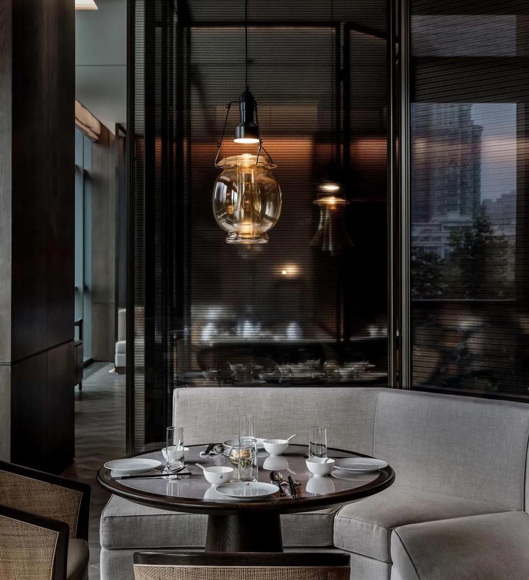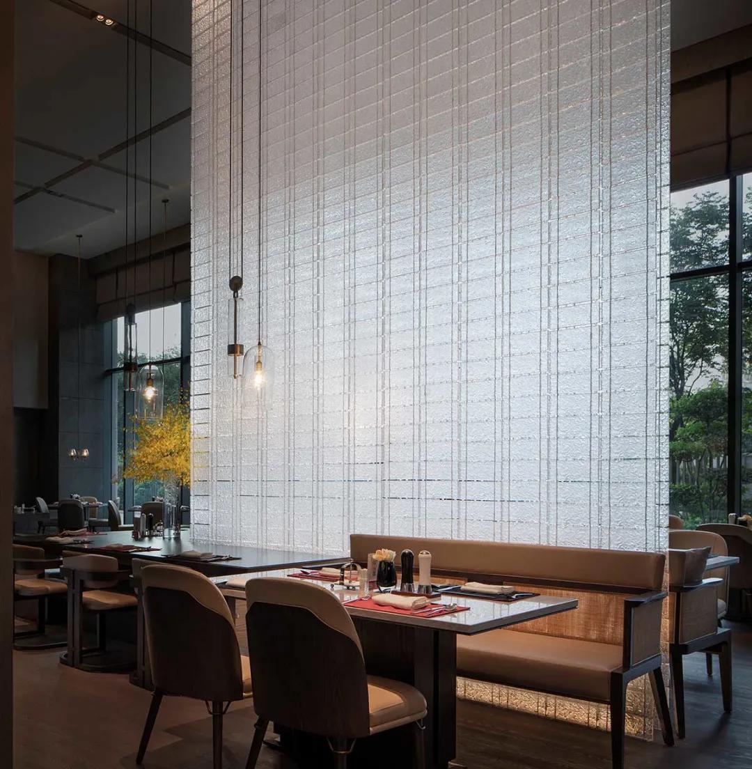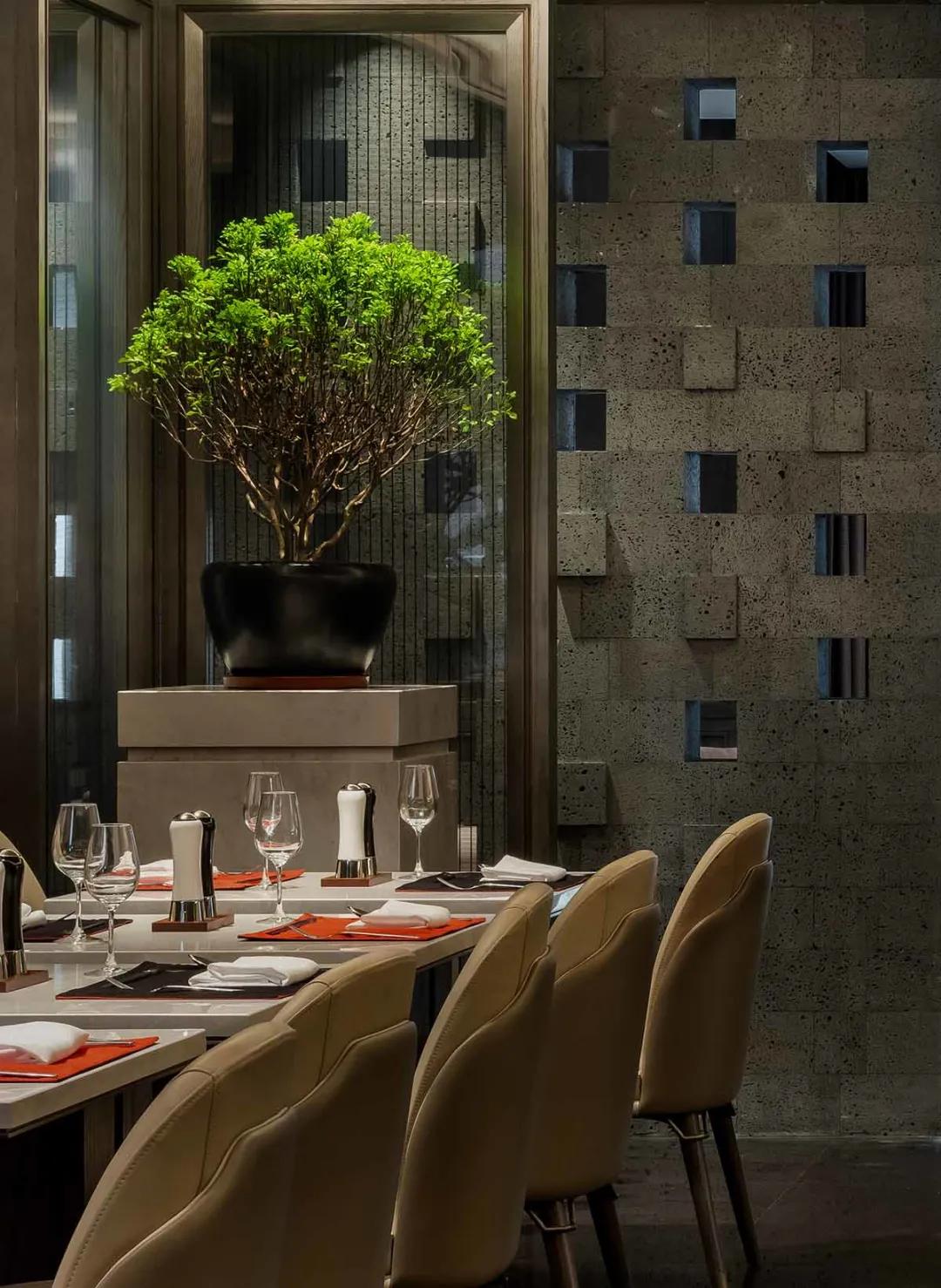 《周禮·春官·大宗伯》寫道:“以饗燕之禮,親四方之賓客。”全日制餐廳「聚膳邑」延續(xù)了大堂的設(shè)計,穿過兩扇高聳的大門,進入一個從五感即視、觸、聽、嗅、味的感官去體驗的空間,大面積的創(chuàng)意磚墻造型,如木榫卯結(jié)構(gòu)一樣咬合交錯,鏤空留白,虛實結(jié)合,光影之下,似乎有些西安古城墻雄奇?zhèn)グ兜挠白印Uw布局交錯穿插,豐富多彩,在空間中運用了一些木構(gòu)架和古銅、亞克力、薄紗等材質(zhì)碰撞在一起,讓材質(zhì)、色彩、光影、綠植、藝術(shù)品等方面的相互搭配和營造,從而打造氣氛活躍的就餐環(huán)境。