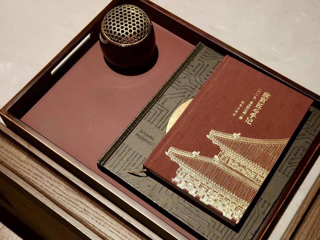 放眼望去,仿佛有一絲穿梁斗拱、紅綠相間、畫棟飛簾的宮殿時空感,沿著中軸線踱步穿過柱廊與門扇,來到大堂吧「舉茗邑」,左側(cè)是供靜謐交談的私密會晤之所,案桌上擺放了精致的香爐、古書籍、印璽,右側(cè)擺放了茶桌由專人表演茶道,沁茗清香,似有似無的清平調(diào)音樂縈繞耳邊,不知不覺中將人帶回千年前。