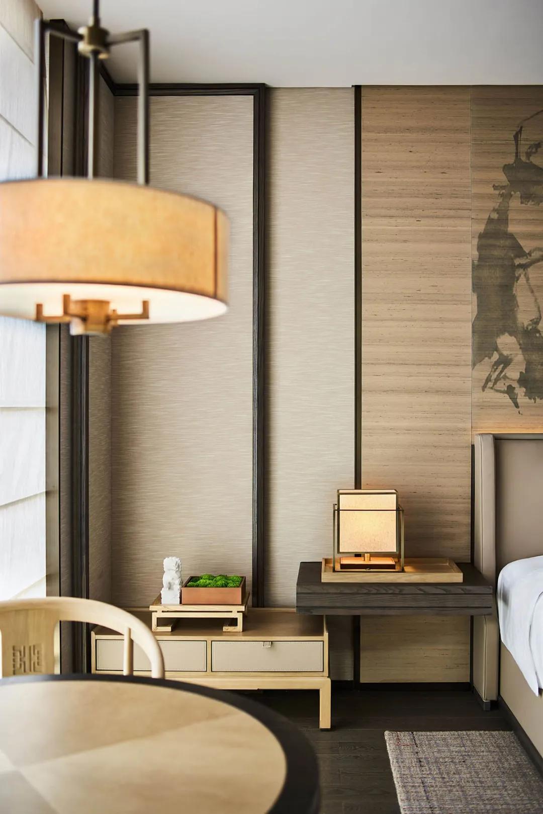客房分為淺色調(diào)及深色調(diào)的不同房型,整體色調(diào)柔和高雅,溫暖質(zhì)樸,開放漆的淺色橡木、舒適細膩的棉麻、羊毛材質(zhì)的地毯,古樸的編織材料……天然材料帶來洗盡鉛華之后的返璞歸真,時間在此慢下來,心境也格外愜意與舒適。具有古典韻味的藝術(shù)品精致細膩,精心打磨的家具既現(xiàn)代又有中式韻味,整體布局大氣高雅,細節(jié)古典精致,點綴以中國紅和皇家藍,以示對十三朝古都的敬意,既具有東方禪意又尊貴典雅。設(shè)計的意義正是給人一種詩意棲居的感受,棲居于此,無疑感受到一種寧靜致遠、璞素雅致的獨特體驗與情感撫慰。