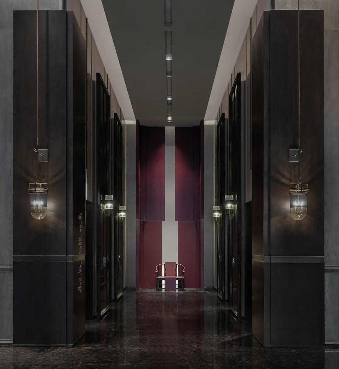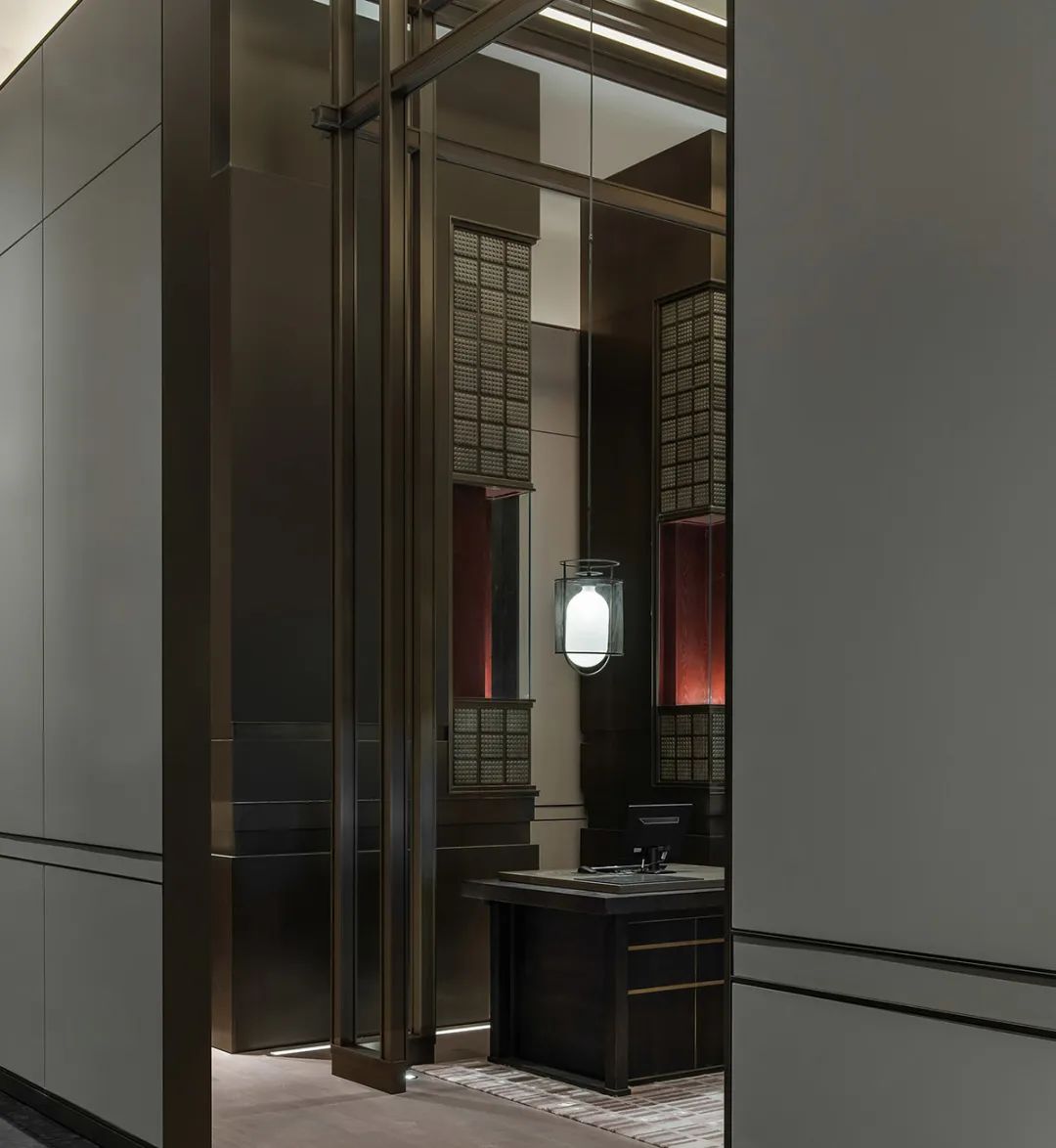 穿過這渾然一體的幽深園林景象與禮敬尊貴的待客之道,威儀非凡的大堂入口便緩緩出現(xiàn)。兩扇莊重大氣的大門矗立兩旁,禮敬尊客,大門上雕刻的細節(jié)來自古代西安城門的門栓靈感,黑色木紋點綴中國紅和古銅,以創(chuàng)新手法重現(xiàn)禮儀之邦西安古城的歷史文化,古樸莊重,極具儀式感。