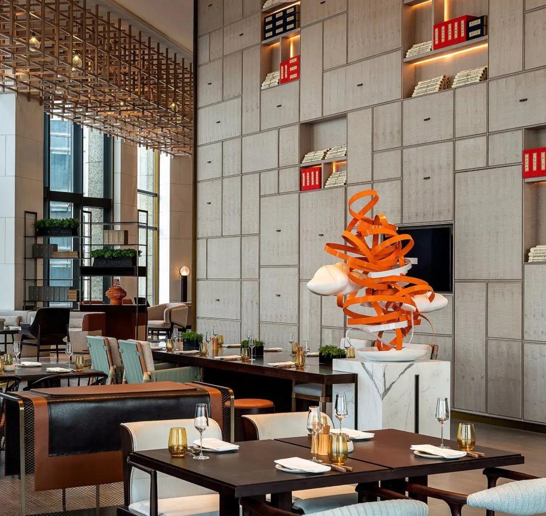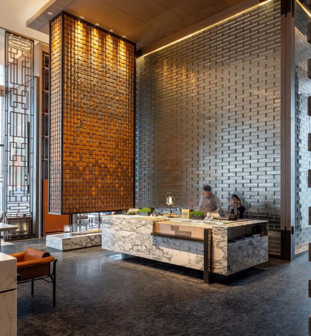 在這里,川劇元素不再是固化的傳統,而是鮮活的靈魂,洋溢著豐富的感情色彩,律動著視覺新意的光芒。大堂吧的金屬線型屏風,用現代設計手法將傳統門窗進行線型分解重組。
