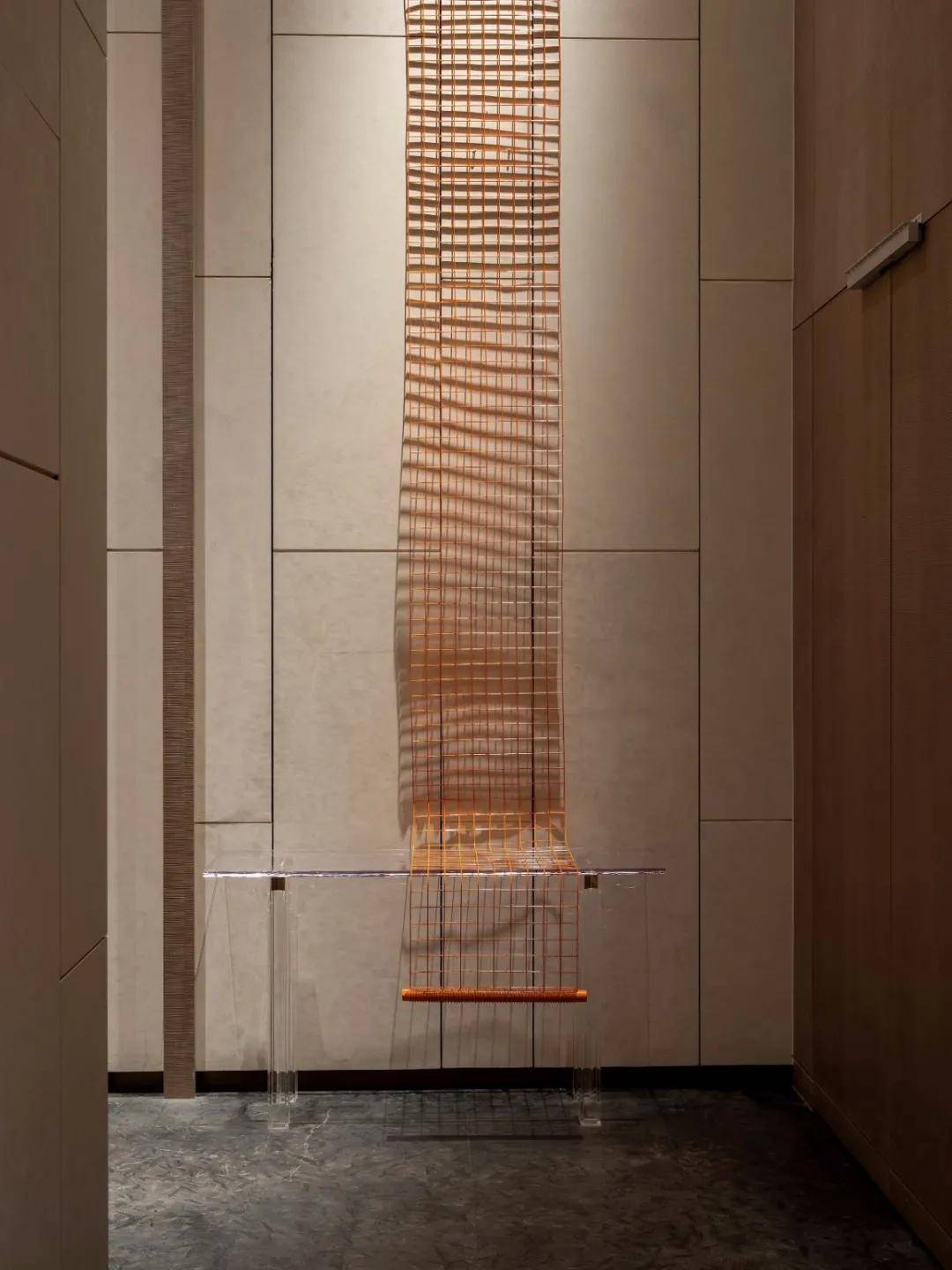 ? 畫軸藝術品:畫軸至上而下落入案幾,以現代手法展現線條及框架結構,與1F電梯廳藝術裝置呼應。