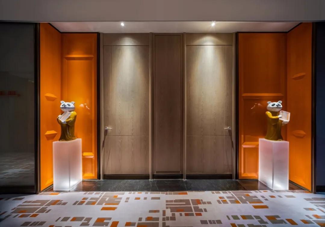 客房門口的書童熊貓形態可掬,手中捧著一本寫著房號的書,仿佛迎接主人回家,讓人倍感有趣、溫暖。
