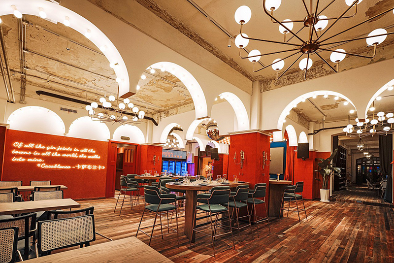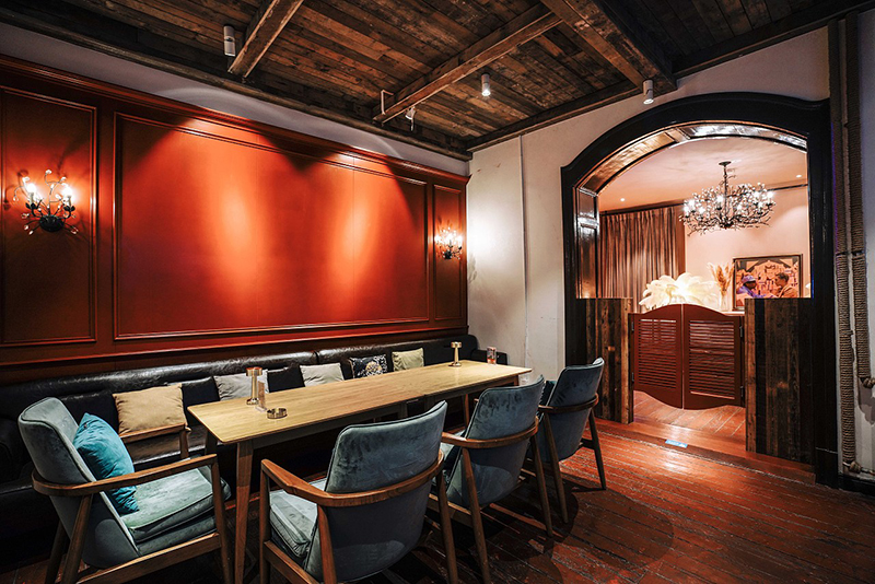 拉開孔雀藍(lán)的復(fù)古木門,仿佛踏入了老歐洲的世界,實(shí)木地板、歐式風(fēng)格和大膽配色。空間中央巨大的迪斯科球?qū)⑴庹凵涞桨唏g的墻面和絲絨壁布的墻裙上,如若不是店內(nèi)的客人穿著現(xiàn)代而時(shí)尚,總會覺得一不小心跌入了老電影中。
