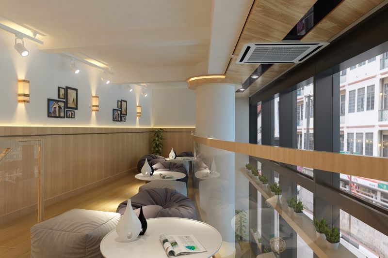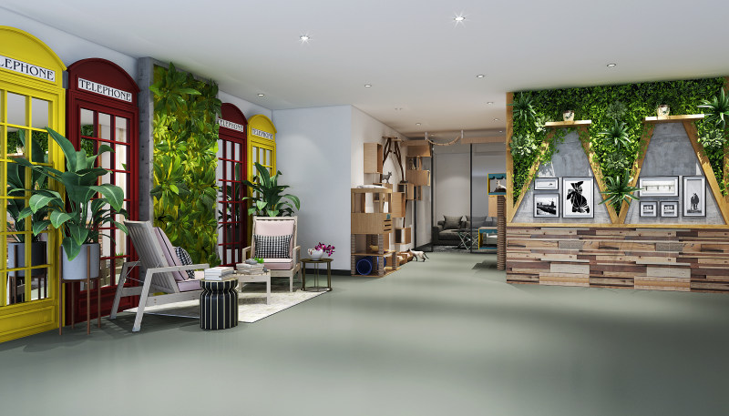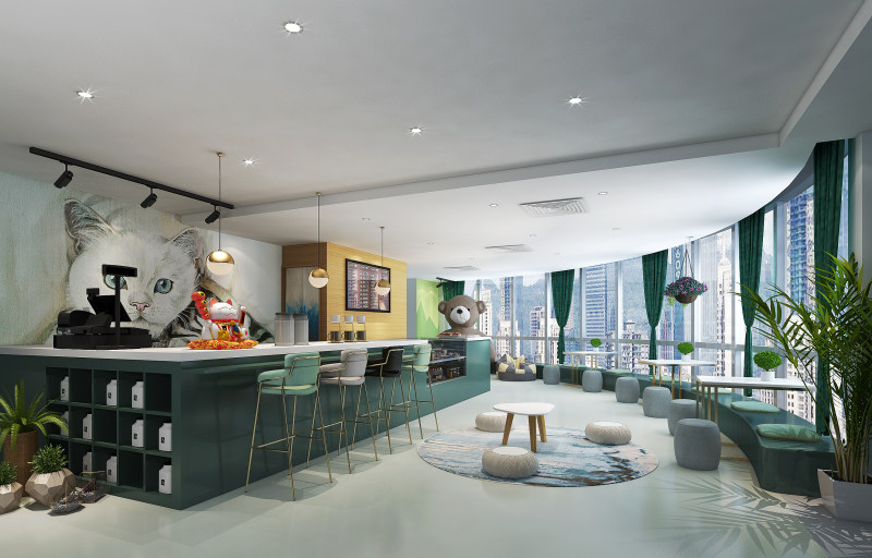 ?紋理清晰的木質地板與原木質桌椅搭配自然,堆滿書籍、雜志的書架把故事悄悄隱藏,安靜陳列的貓式造型微笑著向你招手。