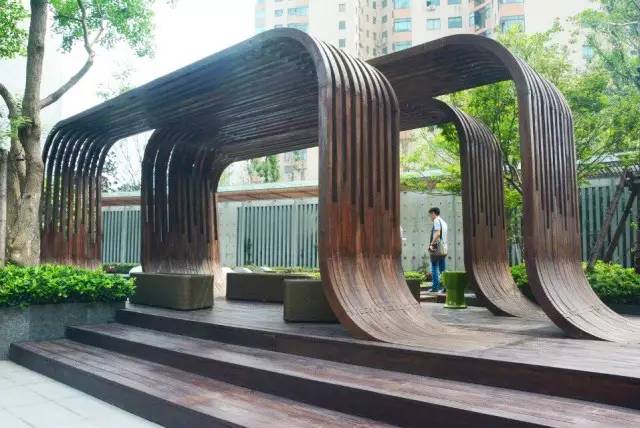在整體的造型上,區別于傳統的涼亭,設計理念上比較前衛,色彩排配上采用原木本色與金屬色相間,涼亭整體上質感更加突出,其次,造型的設計是比較潮流的,多采用流暢線條來表達,這種涼亭非常適合于城市的景觀,因為其精致、造型獨特、創新性強,備受人們的喜愛!