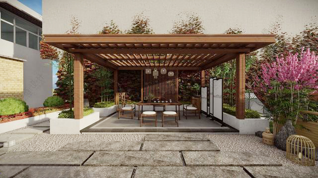現代人庭院中的涼亭,已不像古典式庭院或維多利亞式庭院中的涼亭那么精致、考究,大都結構比較簡單,一般可坐4~6人,周末聚會或朋友間品茗小憩,絕對是個好去處。涼亭的位置一般在園路的盡頭或者園路的交叉處,I上坐在里面的人可觀賞到不同方位的景色。