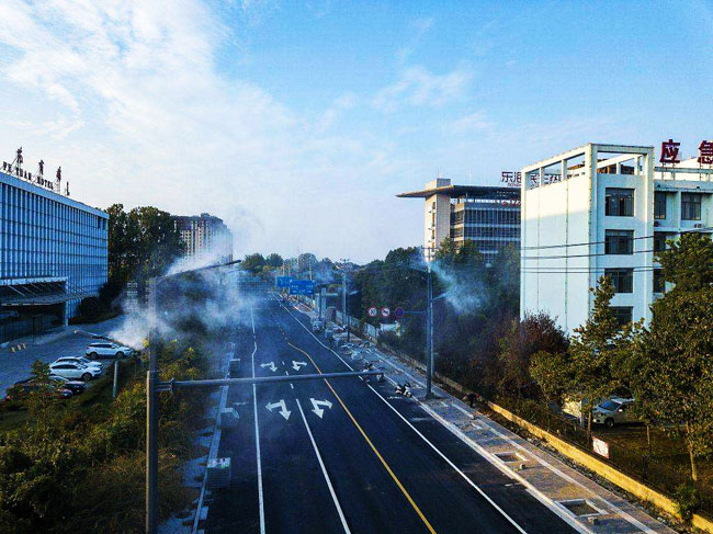2、防暑降溫。智慧燈桿噴霧系統噴灑出的微小水霧顆粒,在空氣中蒸發的同時能夠吸收周圍環境的熱量,從而達到控制局部地區溫濕度,降溫防暑的作用。