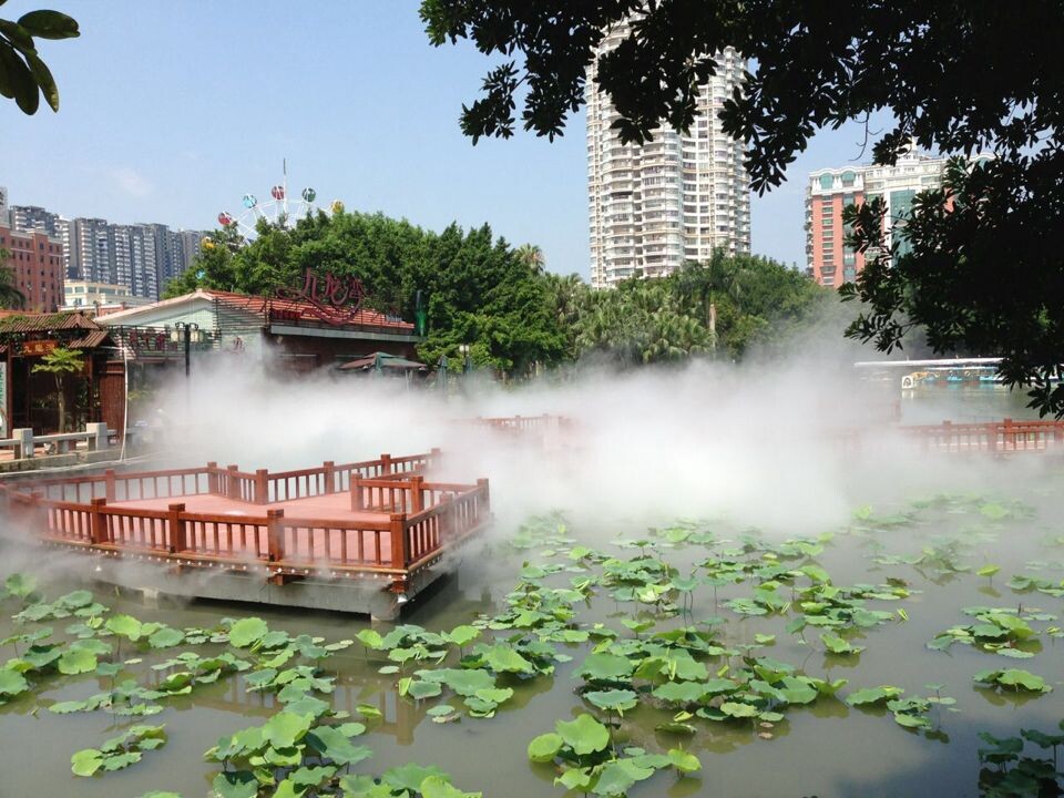 在景觀人造霧領域中,以其降溫、增濕、除塵、除臭的功效,環保效益相當高,景觀霧化能將空氣中氧的正離子中和,氧的負離子最多可提高幾千倍,對于營造和改進人類生存和居住的環境來說,作用重大。