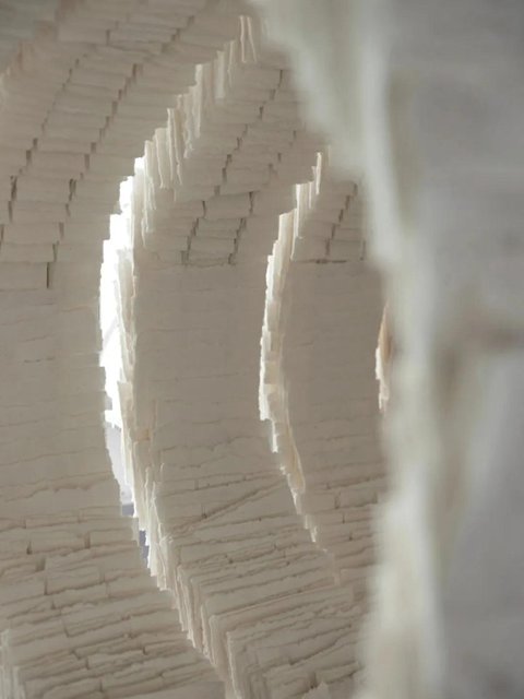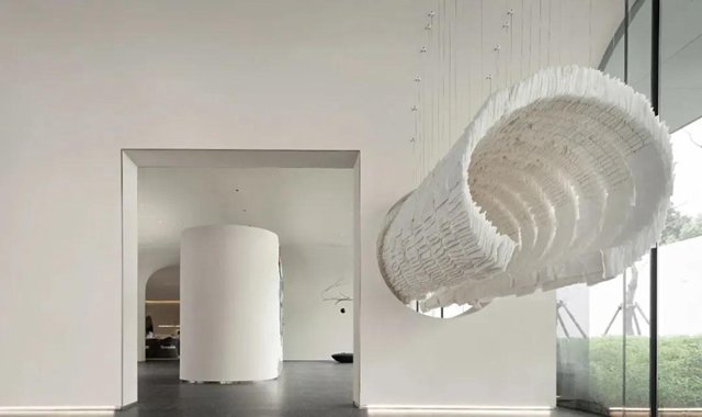 步入內部,紙質的巨型長筒裝置穿插于空間中。視覺也隨著裝置透過墻壁穿梭,呈現出空間的豐富性和新穎性,凸顯了美術館般高雅的藝術氛圍。優美靈動的弧線造型在空間中不同的肆意綻放,移步換景,咫尺之內再造乾坤,伴著步伐穿梭旋轉盡情享受視覺上的新奇的體驗