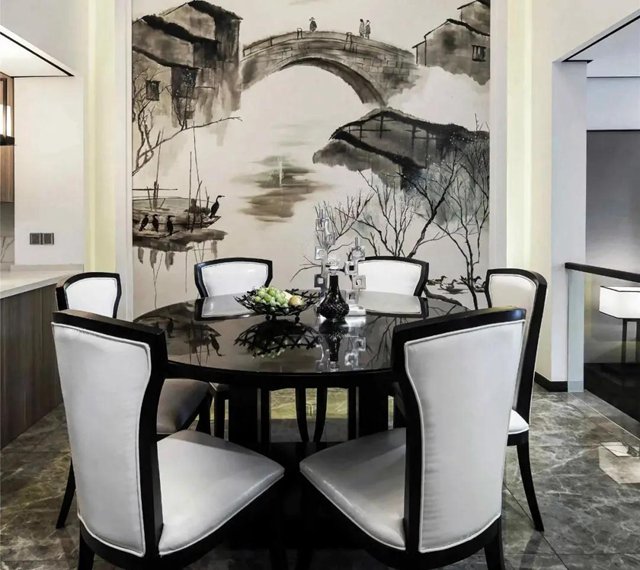 江南山水為景,方圓之態(tài)為構,賦予空間傳統(tǒng)溫婉的氣質(zhì)。墨色與白色相結合,將中式留白之美,盡現(xiàn)于此。