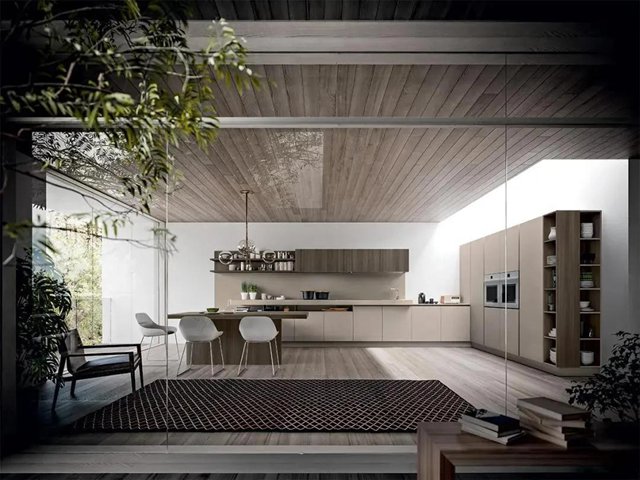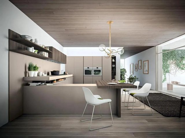 由中心島臺(tái)延伸出的餐桌,以高度來(lái)劃分出烹飪區(qū)和用餐區(qū),在這里享用早餐最能節(jié)省時(shí)間,同時(shí)如果偷懶坐下來(lái)備餐也更加舒服。造型簡(jiǎn)潔、深淺錯(cuò)落的餐桌燈形成流動(dòng)的曲線(xiàn)搭配在這個(gè)淺色調(diào)的廚房,打造出親切清新的小餐吧。