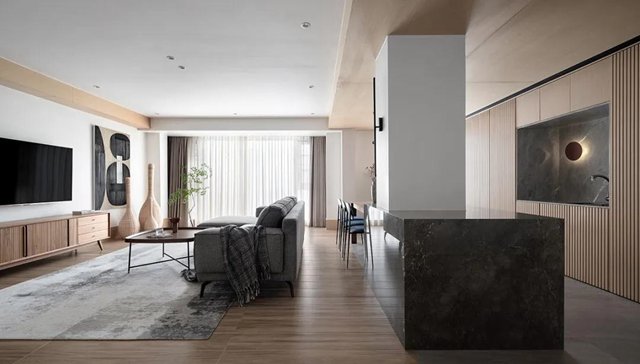 客廳選擇了地板,與空間的木白呼應,整體設計盡可能滿足了女主對木元素的喜愛。在餐廳處,選擇了與島臺相似的地板顏色來劃分空間,地磚和地板直接拼接,搭配出更佳的視覺效果。