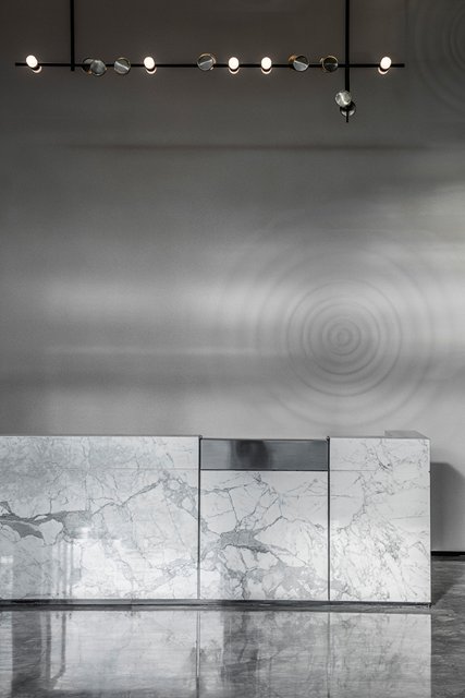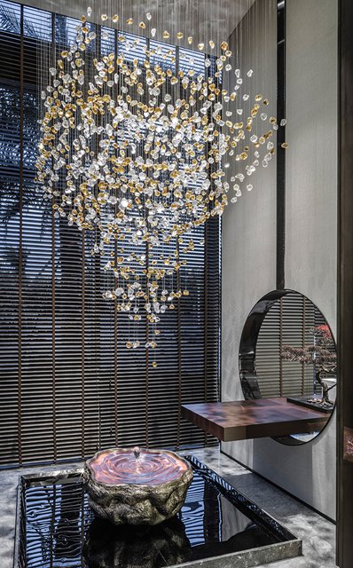 茶藝區(qū)以胡桃木材及大理石磚為主調(diào),水滴狀的玻璃掛飾以靈動之勢緩緩落下,展現(xiàn)“力”與“美”的交互碰撞,使空間剛?cè)岵w驗高貴典雅的恢弘氣勢。