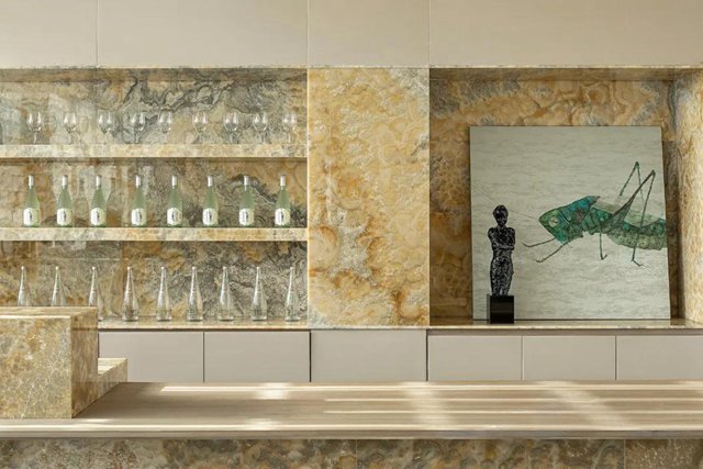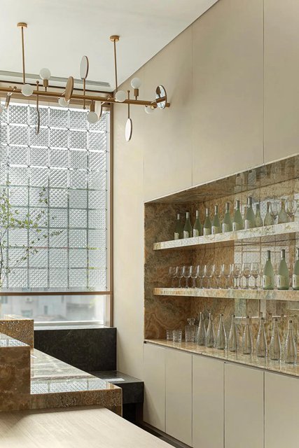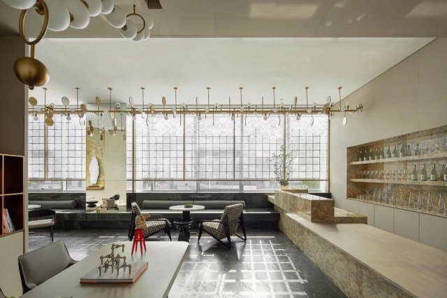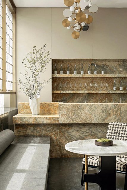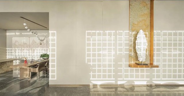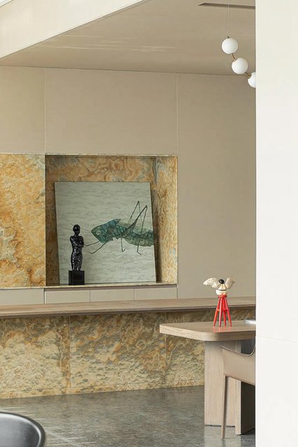 盡頭島臺處,天然水墨玉的紋理猶如一幅綿密的繪畫,目光在其間逡巡,似乎也感受到了海浪的奔涌、海風的呼吸。于是視線隨它移動到側面墻上,光影格紋疊上簡凈的抽象繪畫,畫面描繪的正是羅源山巒的曲線。于是恬靜的空間氛圍又被山的起伏、浪的往復注入一股動態的活力,而光影的加持則如自然天地拋進的一個眼兒媚——這個空間不僅是活的,而且帶著表情。