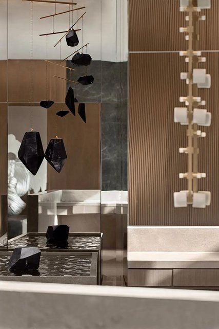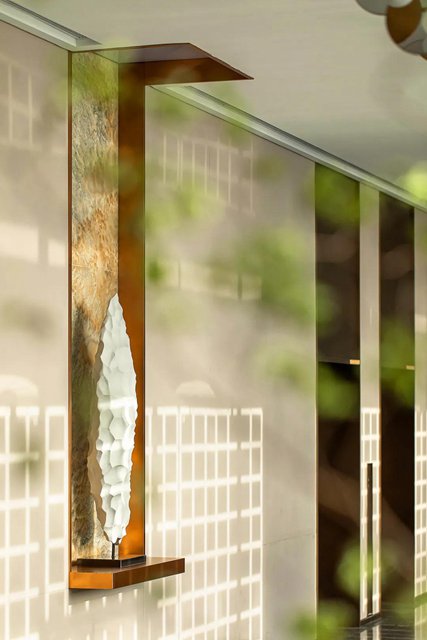 向前,一系列線性延展的平衡藝術裝置引導著視線與步調,用一種微妙的藝術感平衡著狹長空間的凝固氛圍,于靜中寓動。而鏡面反射出的虛實感受則如多維度空間的幻象,平添令人玩味的意趣,讓人不由得想要繼續一探究竟。